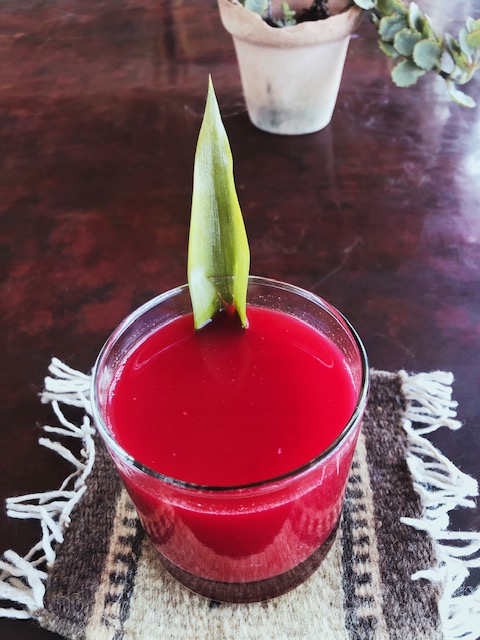 Chilaquiles with Sun-Baked tortillas + Raw Veggies Salsa + Beets & Ginger Detox Batido